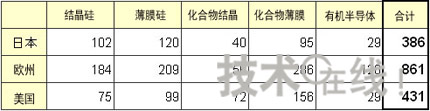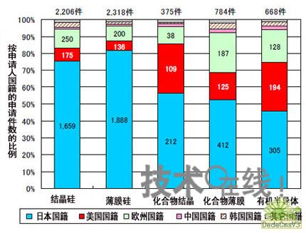 2000~2006年的全球太阳能电池专利的申请件数约高达7970件。从申请人的国籍来看,日本占68.4%,遥遥领先于欧洲(15.3%)和美国(10.6%)。从太阳能电池的种类来看,结晶硅类和薄膜硅类各有7成以上的申请来自日本。化合物半导体方面,结晶类和薄膜类的日本申请均超过5成以上。不过,有机半导体类方面,日本的申请为46%左右,份额小于其它种类,美国(29%)与欧洲(19%)的,两者之和超过日本。
