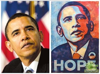 图片说明:左图为美联社记者曼尼•加西亚拍摄的奥巴马照片,右图为街头艺术家谢泼德•费尔雷据此制作的图片。(图/东方IC)