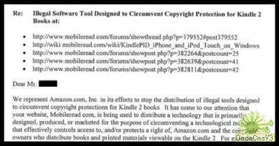 根据Amazon发给MobileRead.com的法律通知,Amazon指称,MobileRead.com网站上刊登一则信息,事关一种以Python语言编写的公用程序,涉及触犯DMCA。