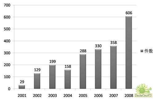 经检索,截止到2008年12月31日,中国集成电路布图设计登记共计2097件(包括国外的企业和个人在中国申请的布图设计登记)。图1为中国集成电路布图设计登记年度分布图。如图1所示,以公开年统计,2001年-2008年间我国集成电路布图设计登记的数量基本保持了较快上升的趋势,这与我国集成电路行业近年来的发展现状相吻合。