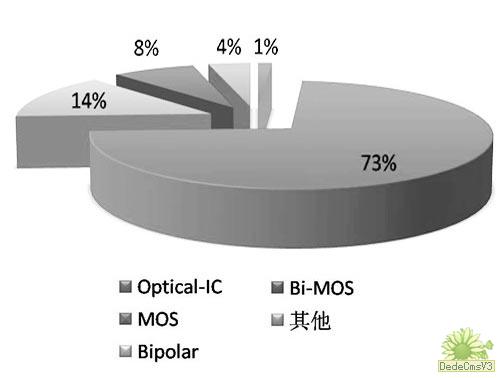 图3为集成电路布图设计专有权产品的结构分布图。如图3所示,已经登记的集成电路布图设计登记所涉及的产品,按结构分类主要包括Optical-IC(光电集成电路)、MOS(金属-氧化物-半导体)、Bipolar(双极)、Bi-MOS(双极-金属-氧化物-半导体)等。其中MOS类型所占比重最大,共计442件,约占总量的73%;其次为Bipolar,共计85件,约占总量的14%。